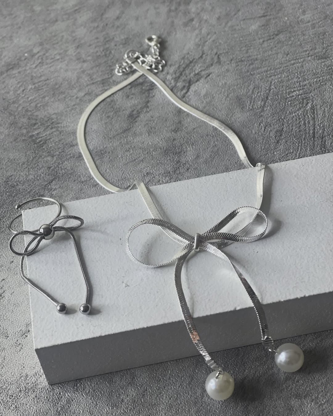 پاپیون گردنبند و انگشتر ضد آب ضد حساسیت روکش و آبکاری شده رنگ نقره ای انگشتر فریسایز هست و گردنبند مناسب تا دور گردن ۴۱ سانتیمتر